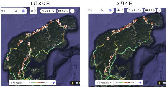 前回は“Z人は、答えの有る試験問題はうまくとけるが、時空間を思い描いて時の流れにうまく合い、人の心を安心させる問題は到底解けない人種のようです。当たり前ですが、ここは政治家が主導して物事を進めることでしかできません。政治家が自身の力を試すときです。大ナタを振るえる胆力は今試されるのです。”今こそ政治家は、正確な情報をもとに日本の将来を見通して道標を示して、その方向へ人々を向かわせてもらいたいものです。 能登半島地震の道路状況を前回と比較してみましょう。
